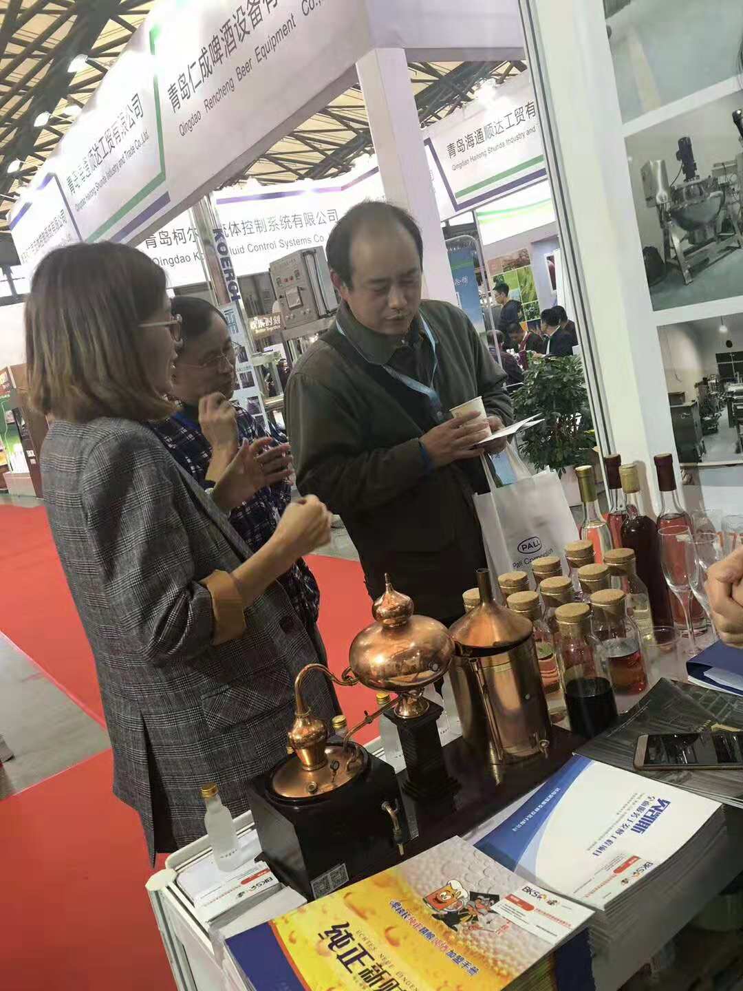 上海展会:主要展示了公司自主商标精酿啤酒加盟品牌“啤校长”、果酒设备、蒸馏设备等。“啤校长”的风味得到了许多客户的认可,尤其是一款美式小麦,口感香气丰富。整个展会期间,啤酒设备众多,所以济南贝凯斯的果酒设备较为引人关注,同时有成功的案例展示,许多客户专门前来咨询。蒸馏设备模型小而精美,比较吸引眼球,许多客户好奇前来询问。
